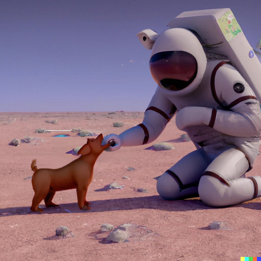 Now, my biggest concern feeding this into AI was receiving back a gruesome image. Honestly…I was REALLY REALLY concerned, because I had already decided to mint whatever the AI output from our prompts. Somehow, some merciful way, the output decided to have a cute little dog nibbling the hand of a person in a spacesuit. This could have gone so badly, but it didn’t, and I love this NFT as our first of the collection.