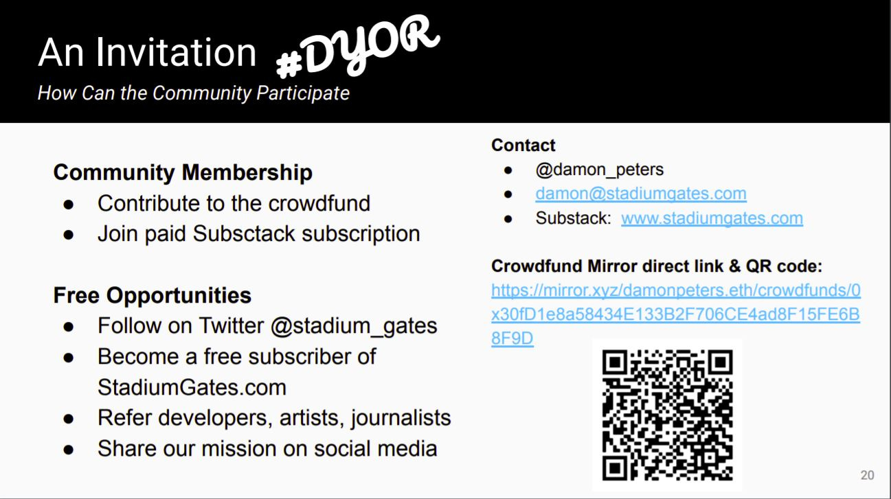 #1. Now that I’m sending this out to the Universe, I’m going to work on scheduling some live presentations of the deck to initiate discussions. I’ll post those updates here, as well as on @stadium_gates Twitter account. Please look out for those updates and share widely to those who may have interest. More to come.